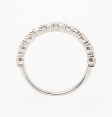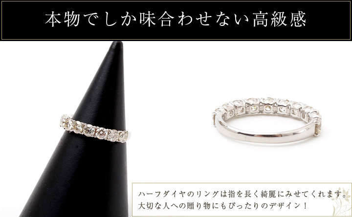 ハーフダイヤのデザインのリングは指を細く長くみせ、上品な大人っぽい女性を演出!