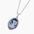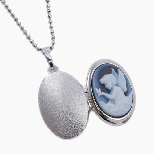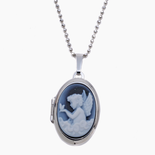 シンプルでペンダントとしても魅力の天使の彫刻のストーンカメオが付いたオーバル・ロケットペンダント。