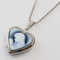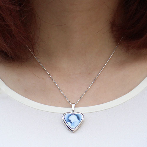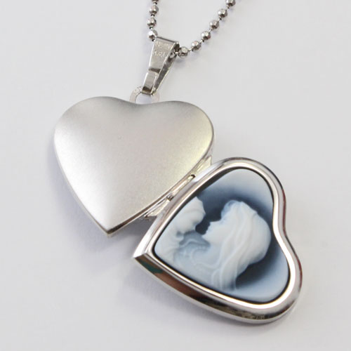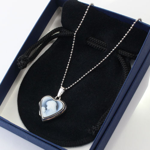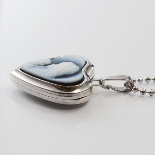 シンプルでペンダントとしても魅力のマリアの彫刻のストーンカメオが付いたハート・ロケットペンダント。