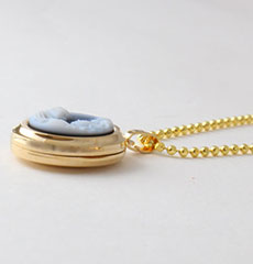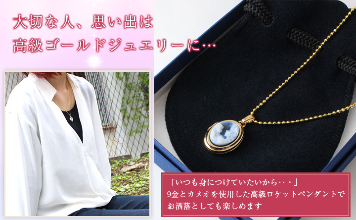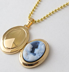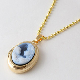女性と赤ちゃんをストーンに非常に細かく彫刻された思わず見入ってしまう魅力的なカメオの付いたペンダント。開けると左右に2枚の写真をセットすることができます。家族、ペットやお気に入りの写真を入れて常に身につけていただけます。(入浴や就眠時は外してジュエリーボックスなどに保管されることをお勧めします。)