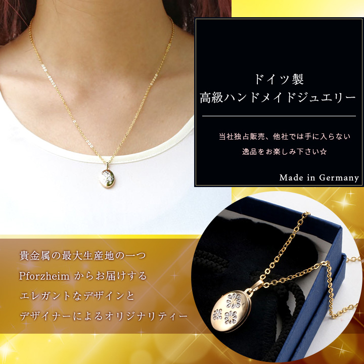 ドイツMERZ社より高級9金ゴールドロケットペンダントが登場しました。両面使えるリバーシブルタイプで表はロジウム模様のお花がモチーフとなり、裏はシンプルな無地で仕上げております。