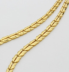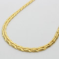 打ち抜かれた純金パーツを絶妙なバランスと正確さで組み上げた豪華なハンドメイドネックレス。持つ人に日々満足感を与え、羨望の視線を受ける黄金ジュエリー。胸元部分を太く、隠れる部分を細くしたことにより、少ない材料で大きく見せ、よりお買得価格を可能にしました。お手持ちのプチペンダントなどを短めに調整して内側にした重ね着けもおススメのおしゃれコーディネートです。また、キラキラ感のある細めのチェーンとのコーディネートも素敵です。太いものはケンカをしてしまうのでご注意を。