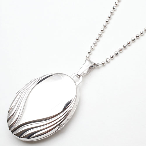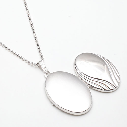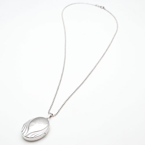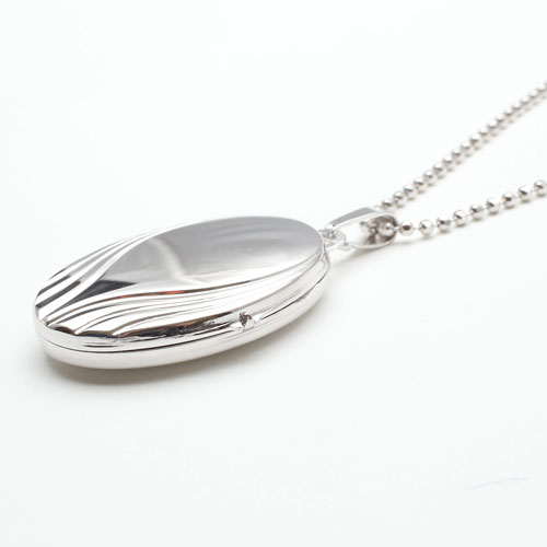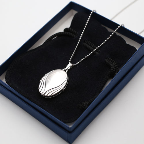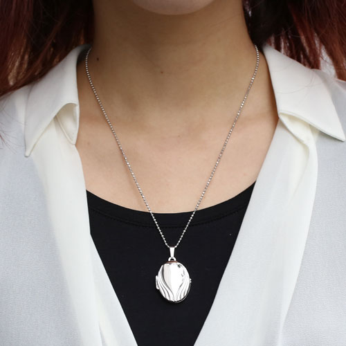情熱の炎の波のイメージの模様のオーバルロケットペンダント。シンプルなシルバー素材との組み合わせは派手すぎず、合わせる洋服によってキュートな感じにもシックでクラシカルな雰囲気にもなります。模様がボリュームたっぷりで高級感がありますよ。男性の方にも抵抗なく着けていただけるシンプルデザイン。裏側は艶消し加工を施していますので傷が目立ちにくく、その日の気分で使い分け。大切な人、大好きなペットの写真をこっそり入れて、お洒落にロケットペンダントを楽しんで。