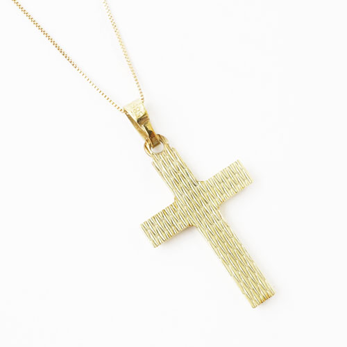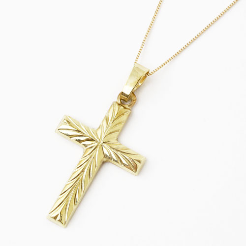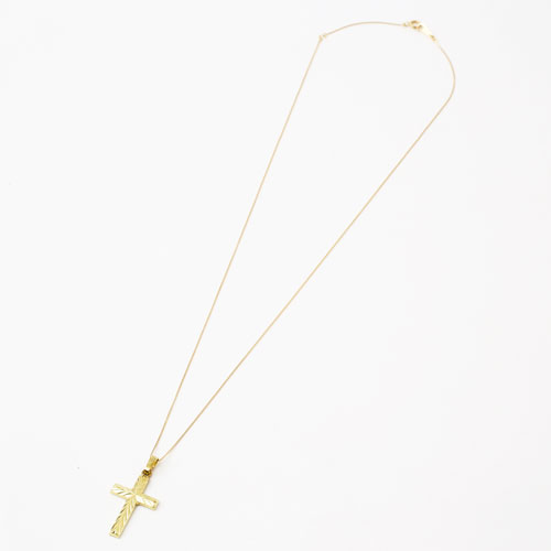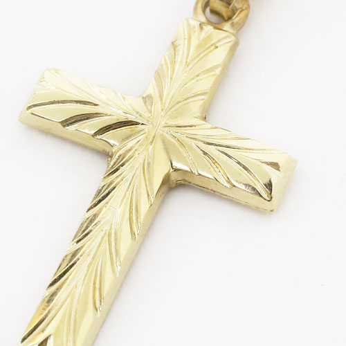 高級素材・14金を贅沢に使用した、カットの美しいドイツ製クロスペンダント。シンプルなデザインだからこそ、14金本来の高級感あふれる光沢が際立ちます。