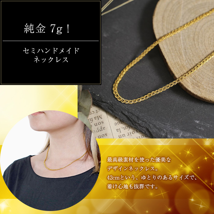 最高級素材の純金(K24)を惜しみなく7gも使った、上品でゴージャスなエレガンティーナネックレス。熟練職人だからこそ出せる魅力がたっぷり引き出されたセミハンドメイド!毎日のオシャレにも、特別な日に着けるジュエリーにもおすすめのネックレスです。
