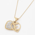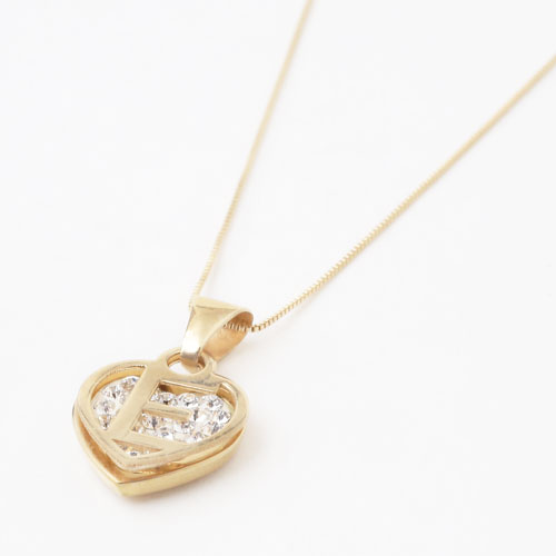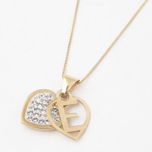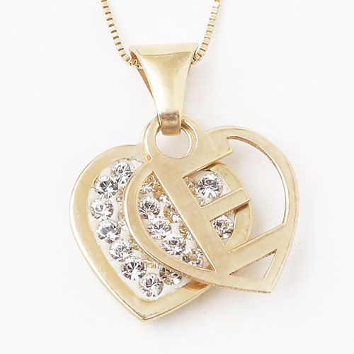9金のかわいいイニシャルハート(E)にきらきらと輝くクリスタルを2重でセットし、