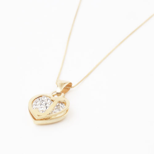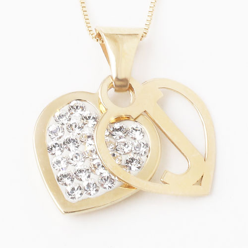 9金のかわいいイニシャルハート(J)にきらきらと輝くクリスタルを2重でセットし、