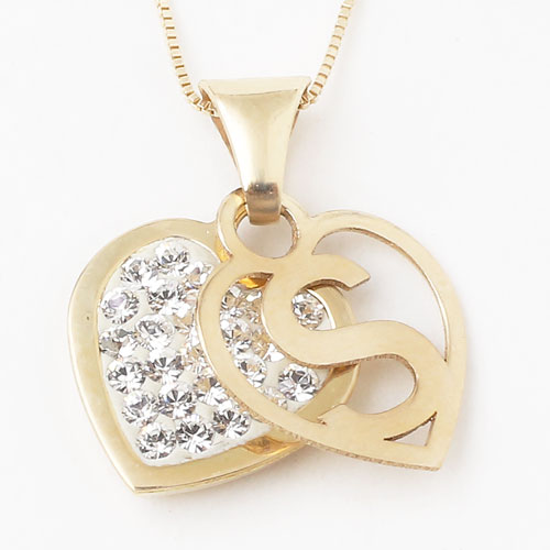 9金のかわいいイニシャルハート(S)にきらきらと輝くクリスタルを2重でセットし、