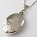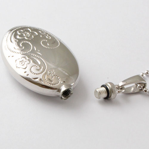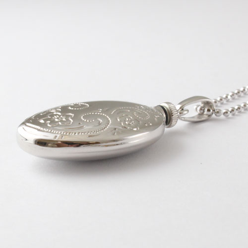 シンプルでペンダントとしても魅力のオーバルシェイプのカロートペンダント。ドイツ製ならではの作りの良さと手彫り調のデザインが、他ではなかなか見つかりません!!☆愛する人を偲び、いつまでも身に着けて、未来へ生きる力と勇気を与えてもらえるでしょう。彫刻も本当に細かくて高級感がありますよ。また、裏面が地金の無地仕上げになっているので、その日の気分によって使い分けて頂けるのも魅力ですね。バチカン部分をねじって開け中に遺灰や遺髪を収めることができます。開口部は非常に小さいので、粉末状にしたものなどを納めてください。