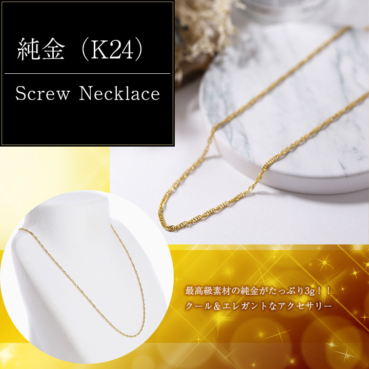最高級素材の純金(K24)をたっぷり3g以上も使った上品でエレガントなスクリューネックレスです。華奢なデザインは女性らしい上品さを自然と引き出し、オフィススタイルからカジュアルまで幅広いコーディネートで大活躍間違いなしのネックレスです。