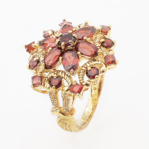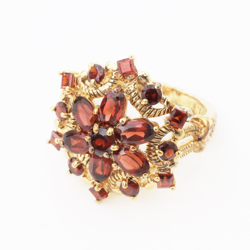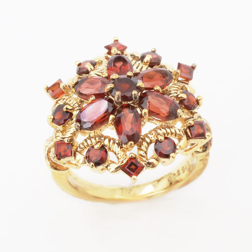 「エレガント&スタイリッシュクール」 ラウンド、スクエア、マーキスカットの天然石を19石合計2カラット以上バンコクにあるプランダジュエリーはタイで3本の指に入るジュエリー生産量を誇り世界中に輸出しています。最高の教育を受けたデザイナーたちが自由に自らの感性を表現できるので他社にない魅力的なジュエリーが誕生しています。きびしい基準のカラーストーンの選別と品質管理が世界一きびしい日本でいつまでも愛されるジュエリーを作るのです。ラウンド、スクエア、マーキスカットの天然石を19石も贅沢に使い、落着いたフラワーデザインにしました。地金部分にはシルバー925をゴールド仕上げにし、天然石をいっそう引き立てる渋さを演出しています。ゴールドカラーとガーネットの落ち着いた色合いは毎日着けたくなること間違いなし♪上品なたくさんのガーネットでより一層ゴージャスに!大切な方へのプレゼントにもお勧めです☆
