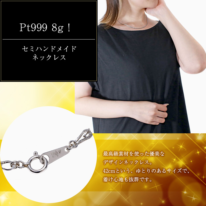 最高級素材の純プラチナ(Pt999)を惜しみなく8gも使った、上品でゴージャスなエレガンティーナネックレス。熟練職人だからこそ出せる魅力がたっぷり引き出されたセミハンドメイド!毎日のオシャレにも、特別な日に着けるジュエリーにもおすすめのネックレスです。
