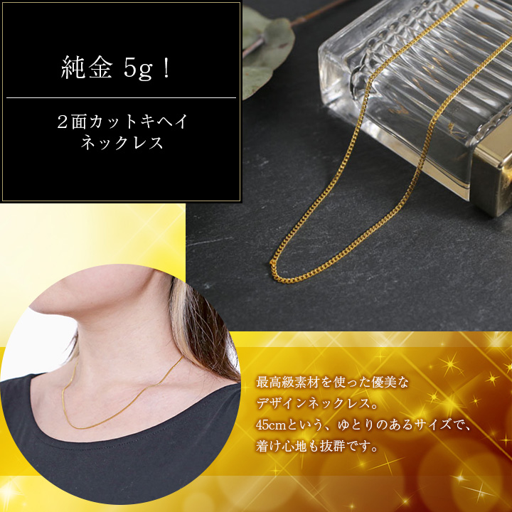 ピュアーゴールド純金の2面カットキヘイが登場しました。上下にカットを施した上品でシンプル・飽きのこないデザインは控え目ながら圧倒的な存在感の黄金の山吹色。しかも、世界的に金の価格が高い現在、資産価値もあり、見た目の繊細な幅のわりにずっしりとした5gの重量感を感じてください。ペンダントトップ用としてもちょうど良い幅と45cmの長さ。もちろんそのままでも、人とは違った黄金の色合いが何気ないおしゃれを演出します。男性の方にもお着けいただける男女兼用デザインは、ペアーででも永遠の黄金の輝きを共有できるでしょう。24金を5g以上も使い、シンプルで年齢問わずいつまでもお使いいただけるチェーンは大変買い得です。フォーマルの席はもちろん、シンプルで使いやすいデザインは普段のおしゃれにも最適!ひとつ持っていればとても安心。特別な時のために揃えておきたい黄金ジュエリーです☆当店の商品は、全て、ひとつひとつ厳しい検品、チェックを通過していますので、どうぞご安心ください。男性の方にも抵抗なく着けてもらえるデザインのキヘイチェーン。ペアーで持たれてもおしゃれです。