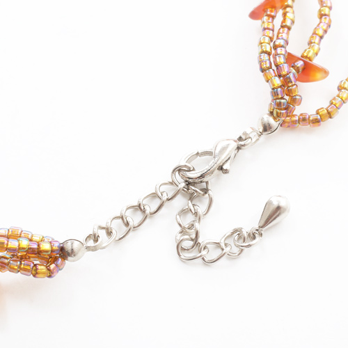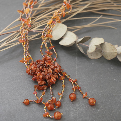 天然石をたっぷりと贅沢に使いボリューム感を出して華やかに胸元を演出します。チェーンの長さはちょっと長めの43cmで首周りに余裕を持たせ上品に着けて頂けます。また、約5cmのアジャスター付ですのでドッグネックとしてもお使いいただけます。