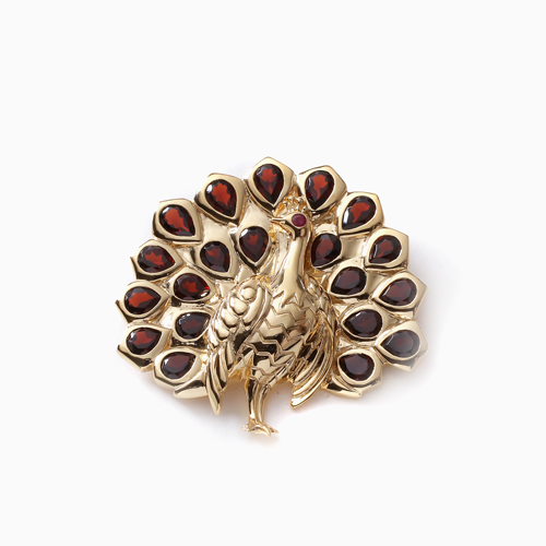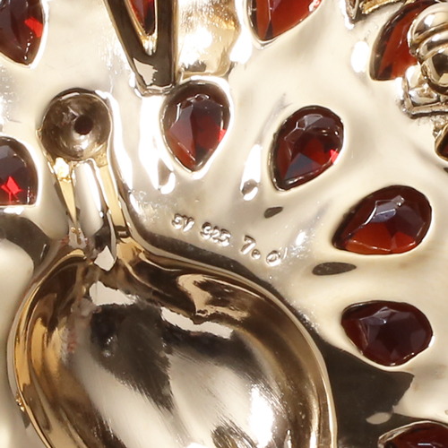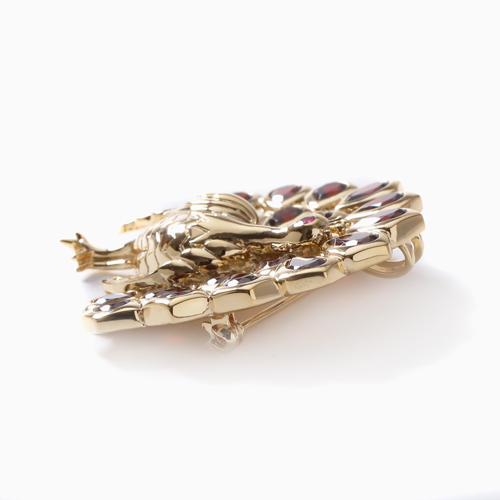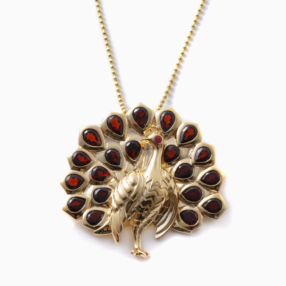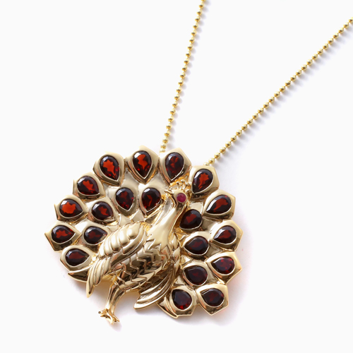 プランダ社の熟練職人の技と合計7.0カラットの贅沢な天然ガーネット。地金部分にはシルバー925にゴールドコーティングを仕上げ、天然石をいっそう華やかに引き立てる演出しています。チェーンの長さは50cmまたは60cmをご用意しました。また、チェーンを外してブローチとしてもお使いいただけるようにシャダン式の留具を内側に取り付けています。