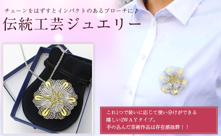 ペンダントとしてもブローチとしてもお使いいただけるお得なジュエリーで、その日の気分で使い分けができるのもうれしいですね。好き嫌いの少ないフラワーデザインはこれからの季節、プレゼントにもぴったりですよ。