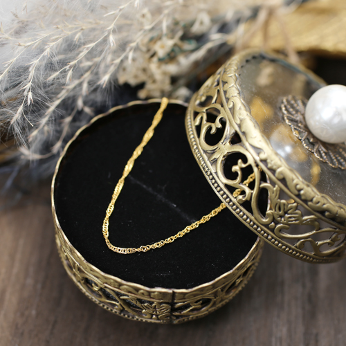 ダブルキヘイにロールをかけひねりを加え、キラキラと煌びやかに輝スクリューネックレスは、上品な大人っぽさを引き出し、普段の装いをぐっとエレガントに