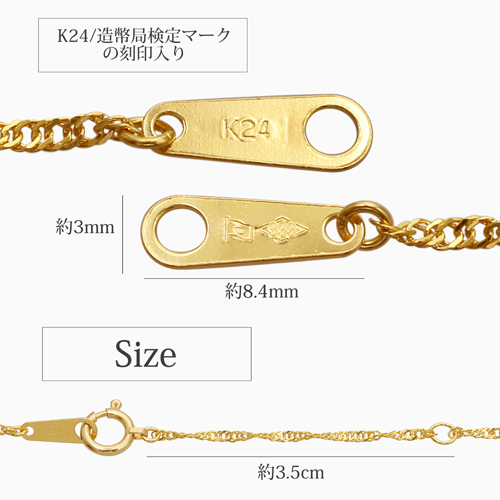 45cmという、ゆとりのあるサイズで、着け心地も抜群!!プレート部分には、「K24と造幣局の検定刻印」が有り、素材と品質の良さも証明されています。