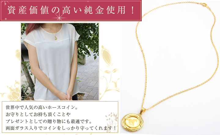 ツバル製、純金ホースコインに18金のデザインフセコミ枠を巻きさらに両面にクリスタルガラスをはめ、アズキチェーンをセットしたコインペンダント。世界的に金地金が高騰している昨今、資産価値もありお守りとしてやプレゼントにも喜ばれます。