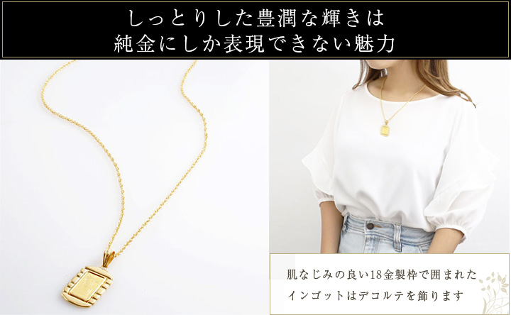 | 素材 | ・インゴット:24金(2g) ・枠:18金 ・チェーン:真ちゅう(金メッキ仕上げ) |