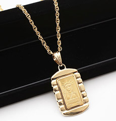 スイスクレジット社発行の純金インゴット。18金製のデザイン枠で囲まれ、ラグジュアリーで艶感のあるペンダントトップに。表面には【LIBERTY 鋳造年号】、裏面には純金の証フォーナイン9999 2g FINE GOLD CREDIT SUISSEの文字とシリアル番号が刻印されており、確かな信頼とこだわりを感じることができます。自由の女神の王冠の7つの突起には、”7つの大陸と7つの海に自由を広げる”という意味があり、「自由の象徴」として知られています。サービスチェーンには、長さの選べる縄チェーンを付属。バチカン部分が大きいので、お持ちのチェーンやオメガタイプのチェーンと合わせても◎存在感のある大きさと上品な輝きは、ジャケットスタイルからデニムスタイルまで幅広く活躍してくれること間違いなしです♪