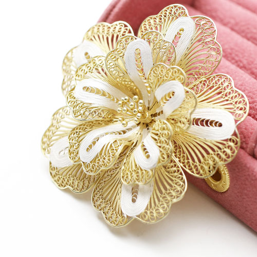 イタリアの3大貴金属製品生産地(ゴールドトライアングル)の一つ「ヴィチェンツァ」。針金状のパーツを熟練職人が手で組んだセミハンドメイドアクセサリーです。洗練されたデザインセンスとイタリア人ならではのゴールドとシルバーの色使いはイタリアはもちろん世界中の大人の女性たちを魅了しています。素材にはシルバー925を使いボリュームがあるのに軽い着け心地を可能にしました。ペンダントとしてもブローチとしてもお使いいただけるお得なジュエリーで、その日の気分で使い分けができるのもうれしいです。人気のフラワーデザインはこれからの季節、プレゼントにもぴったりですよ。※数量限定の商品ですので、売り切れの際はご了承ください。