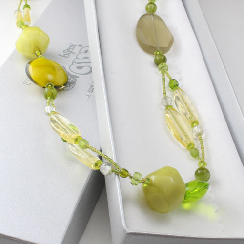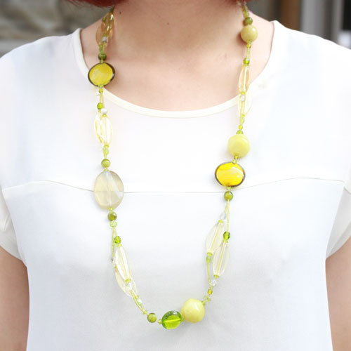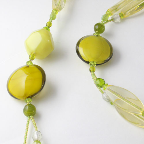 世界的に人気のロングタイプをグリーン系の上品な色合いとシェイプで仕上げました。ベネチアンガラス、合金、樹脂を絶妙なバランスで使い、ボリューム感と軽い着け心地を実現。 これからの季節、プレゼントにもぴったりですよ。