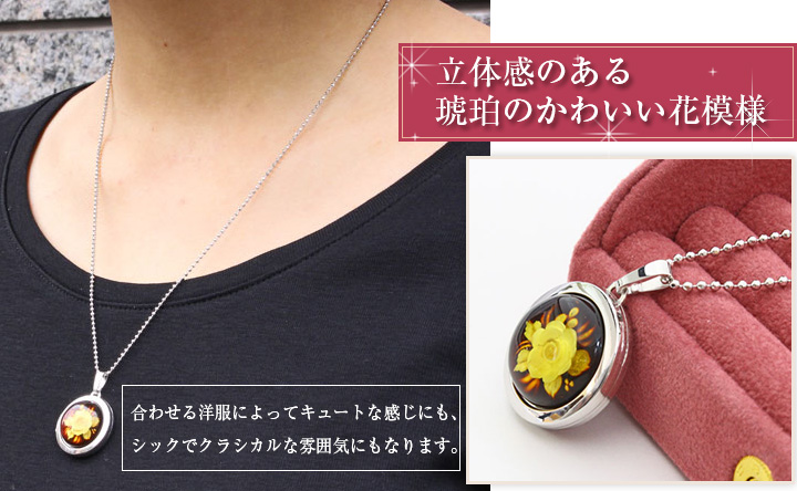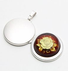 琥珀のかわいい花のラウンドロケットペンダント。シンプルなシルバー素材との組み合わせは派手すぎず、合わせる洋服によってキュートな感じにもシックでクラシカルな雰囲気にもなります☆立体感のある模様がボリュームたっぷりで高級感がありますよ。男性の方にも抵抗なく着けていただけるシンプルデザイン。裏側は艶消し加工を施していますので傷が目立ちにくく、その日の気分で使い分け。大切な人、大好きなペットの写真をこっそり入れて、お洒落にロケットペンダントを楽しんで☆