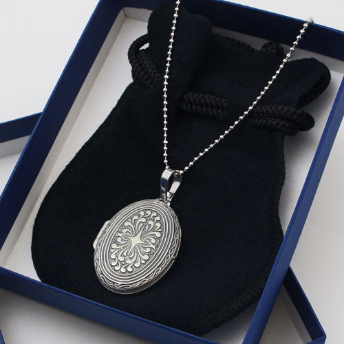 アンティーク模様のオーバルロケットペンダント。シンプルなシルバー素材との組み合わせは派手すぎず、合わせる洋服によってキュートな感じにもシックでクラシカルな雰囲気にもなります☆立体感のある模様がボリュームたっぷりで高級感がありますよ。男性の方にも抵抗なく着けていただけるシンプルデザイン。裏側は艶消し加工を施していますので傷が目立ちにくく、その日の気分で使い分け。大切な人、大好きなペットの写真をこっそり入れて、お洒落にロケットペンダントを楽しんで☆