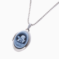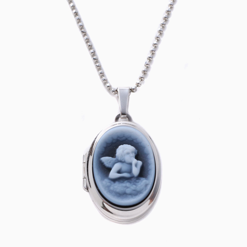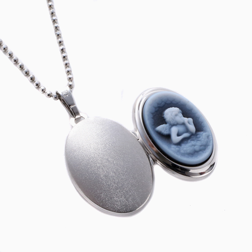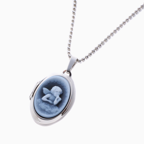 シンプルでペンダントとしても魅力の天使の彫刻のストーンカメオが付いた少し大きめのオーバル・ロケットペンダント。