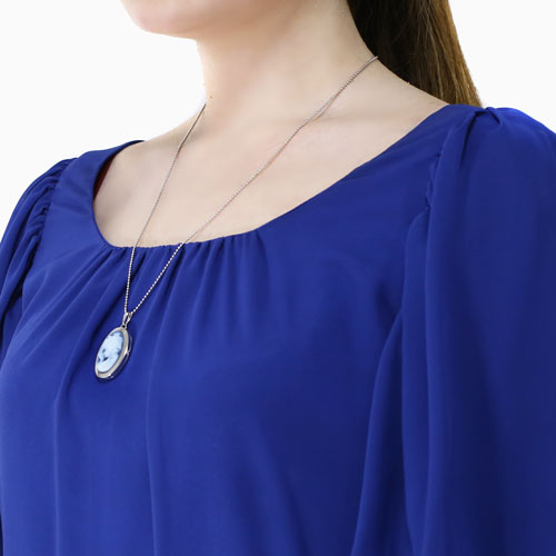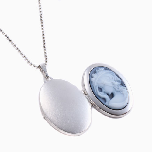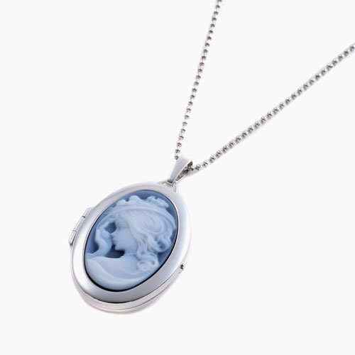シンプルでペンダントとしても魅力の女性の彫刻のストーンカメオが付いた少し大きめのオーバル・ロケットペンダント。