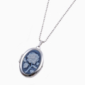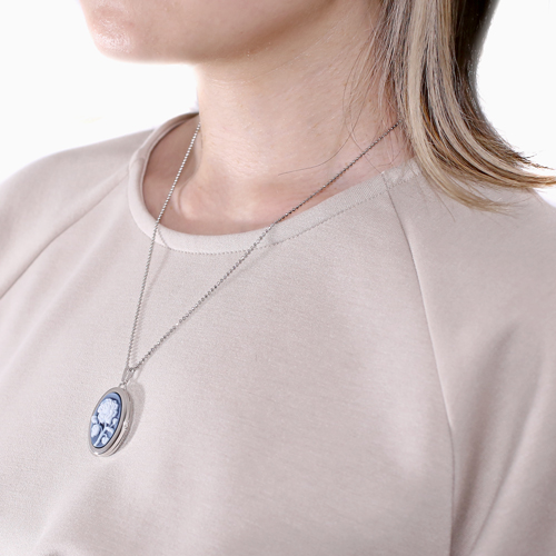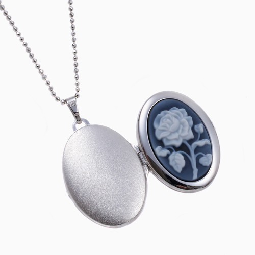 シンプルでペンダントとしても魅力の花の彫刻のストーンカメオが付いた少し大きめのオーバル・ロケットペンダント。