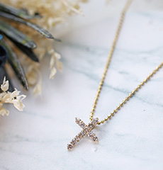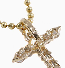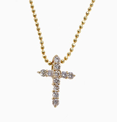 11石の天然ダイヤモンドクロスはその縦横比率が美しいと言われています。ライトブラウンカラーのダイヤモンドが18金台のゴールドカラーととけあい自然な美しさを醸し出しています。