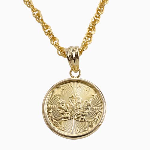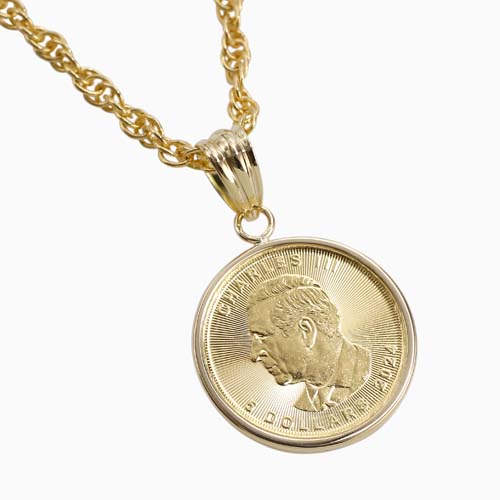 カナダ政府鋳造、純金メイプルリーフコインに18金のシンプルフセコミ枠を巻き、サービスチェーンをセットしたコインペンダント。世界的に有名なカナダのメイプルリーフ金貨。金地金が高騰している昨今、資産価値もありお守りとしてやプレゼントにも喜ばれます。