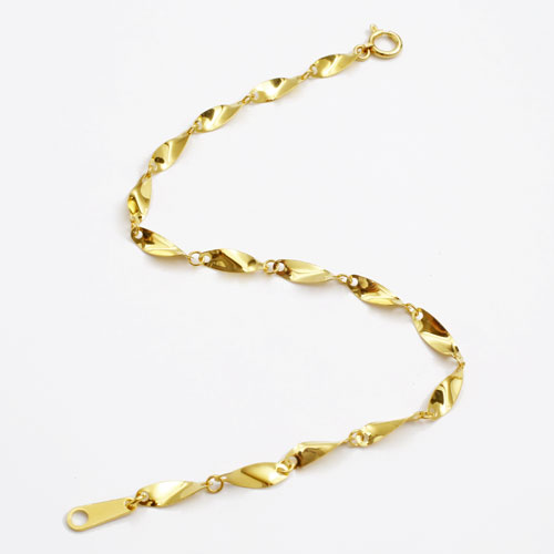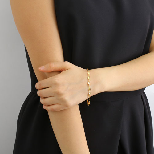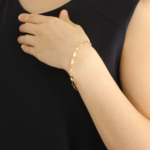 最高級素材・純金のみでお作りしたオーバルパーツにひねりを加えそれぞれを独立させてつなぎ合わせているデザイン。手首が動くたびにひねりを加えて独立したパーツがキラキラと輝き神秘的な雰囲気を醸し出します。非常にシンプルなパーツの為、どんなスタイルにも合わせやすく、普段の装いをぐっとエレガントに引き立ててくれます。