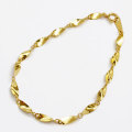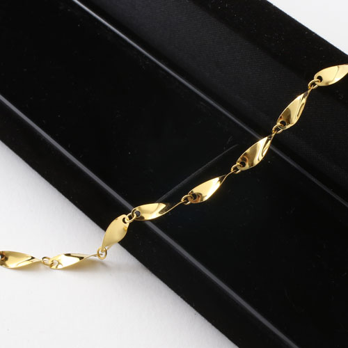 最高級素材である、純金を惜しみなく使用した、高級感あふれるデザインブレスレット。最高級素材・純金のみでお作りしたオーバルパーツにひねりを加えそれぞれを独立させてつなぎ合わせているデザイン。手首が動くたびにひねりを加えて独立したパーツがキラキラと輝き神秘的な雰囲気を醸し出します。非常にシンプルなパーツの為、どんなスタイルにも合わせやすく、普段の装いをぐっとエレガントに引き立ててくれます。お手持ちのウォッチや石の付いたブレスなどとの重ね着けにもお勧めで、純金ならではの色合いがより魅力的ななコーディネートを演出します。めらかに手首に沿うブレスレットは、着け心地も抜群です。また、プレート部分には、「K24(刻印)」が有り、素材と品質の良さも証明されています!高価な純金をたっぷりと使用し、熟練職人が一つ一つ手作業で組上げた高品質ブレスレットは大変お買い得です。