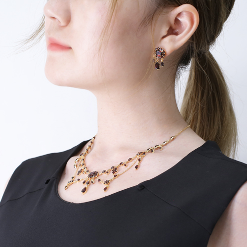 ラウンド、オーバル、マーキスカットの天然石を合計7カラットも贅沢に使い、ゴージャスにクレオパトラ調デザインにしました。地金部分にはシルバー925をゴールド仕上げにし、天然石をいっそう引き立てる渋さを演出しています。別売りのネックレスとコーディネートしていただけると華やかさが倍増します。