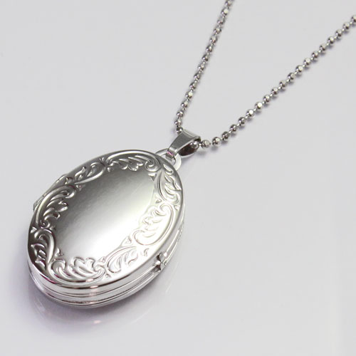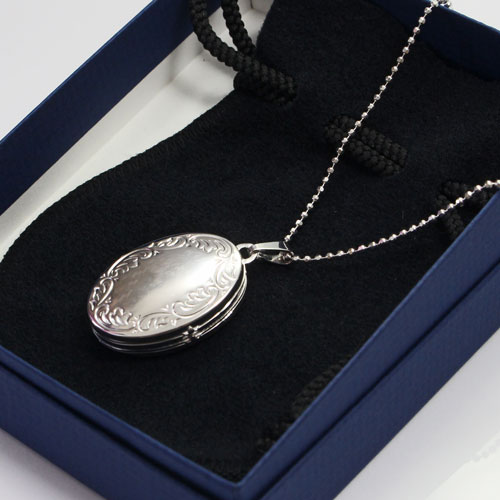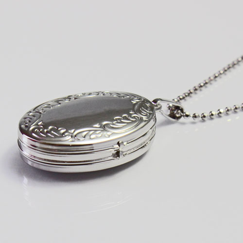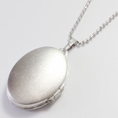 シンプルでペンダントとしても魅力の写真が4枚入るシルバーのオーバル・ロケットペンダント。