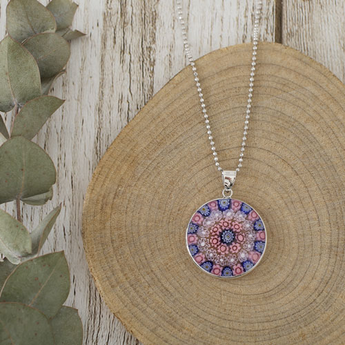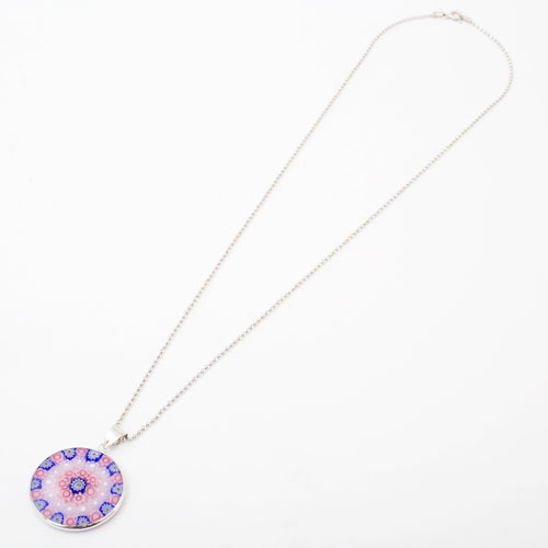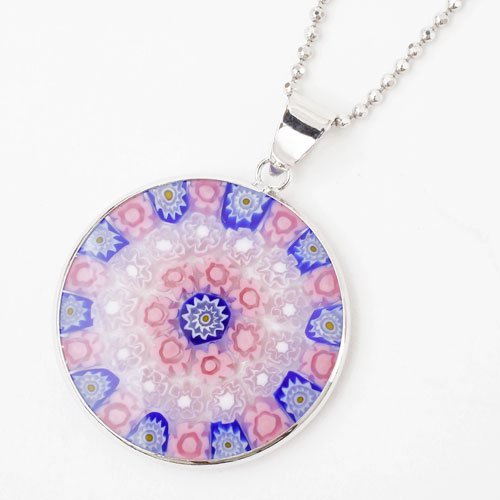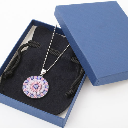 円形に並べて、窯の中で溶かして一体化して作られた、まさに熟練職人による技。ミレフィオリ(幾千もの花)と言われているこのペンダントはイタリアでは定番の昔から人気のアクセサリーです。 これからの季節、プレゼントにもぴったりですよ。