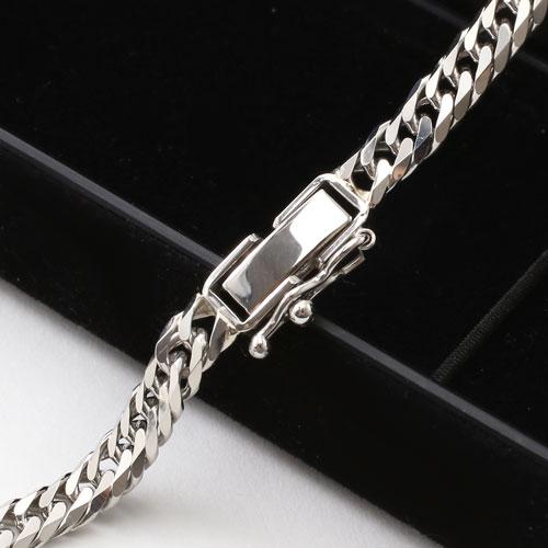 上下2面と斜めに4面カットを施しダブル(通常より細かく)で編み上げました。通常の2面カットに比べ圧倒的にカット面が多いため、光の反射面も多くなり輝きが断然違います。プラチナ850を30gも使い、これだけ手の込んだチェーンは大変お買い得です。フォーマルの席はもちろん、シンプルで使いやすいデザインは普段のおしゃれにも最適!ひとつ持っていればとても安心。特別な時のために揃えておきたいジュエリーです☆当店の商品は、全て、ひとつひとつ厳しい検品、チェックを通過していますので、どうぞご安心ください。男性の方にも抵抗なく着けてもらえるデザインのキヘイチェーン。ペアーで持たれてもおしゃれです。