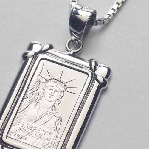 クレジットスイス銀行製、純プラチナのインゴットにプラチナ900のデザイン枠を付けイタリア製のベネチアンチェーンをセットした高級仕様です。世界的にプラチナが高騰している昨今、資産価値もありお守りとしてやプレゼントにも喜ばれます。表のデザインは自由の女神、裏にはクレジットスイス銀行の刻印とシリアルナンバーがあり、確かな品質が保証されています。表面には、【 LIBERTY 鋳造年号】裏面には純プラチナの証し 999.5 1g PLATINUM CREDIT SUISSEの文字とシリアル番号が刻印されています。