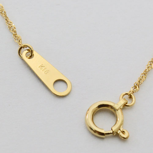 高級素材である、18金(K18)を惜しみなく使用した、気品あふれるチェーン。華やか過ぎない、洗練されたデザインのチェーンは、お持ちのどんなペンダントトップにも合わせやすく、普段の装いをぐっとエレガントに引き立ててくれます。45cmという、ゆったりサイズのスクリューチェーンは、着け心地も抜群!!プレート部分には、「K18(刻印)」が有り、素材と品質の良さも証明されています。