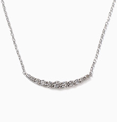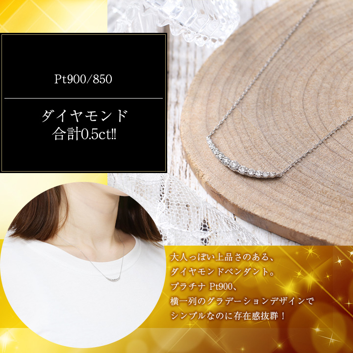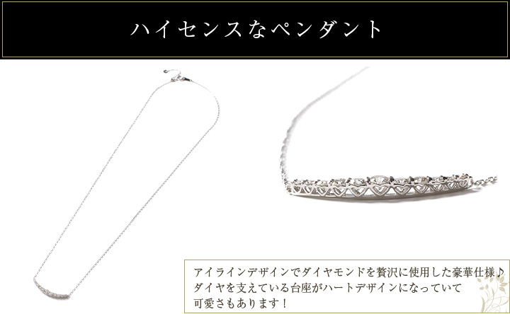 人気のモチーフデザインのアイライン。びっしりとダイヤモンドをグラデーションの一列にセットしました。しかも、プラチナ 純度90%の素材はアレルギーも起こしにくく胸元に魅力的な輝きを醸し出してくれます。ちょうど良いサイズですので存在感が高く胸元に華を添えるお洒落の広がるアクセサリーとして注目です。また、チェーンには45cmまでのお好みの長さに調整できるスライドチェーンを付属していますので使い勝手の良い仕様となっています。年齢を問わないマルチデザインですので、いつまでもお使いいただけます。高純度プラチナ素材にダイヤモンドでこの価格はありそうでなかなか見つからない超お買得品です。年齢やスタイルを選ばないシンプルなデザインはプレゼントにも最適です。