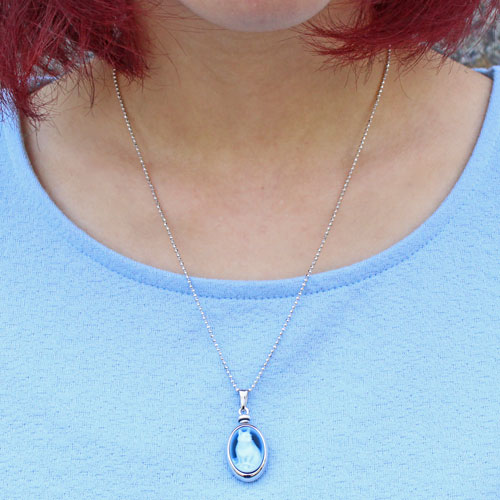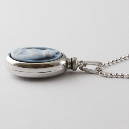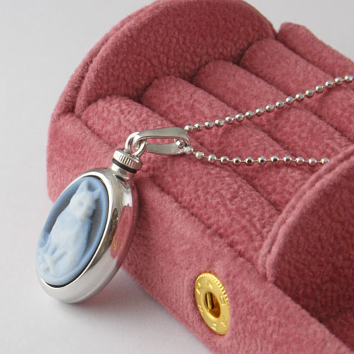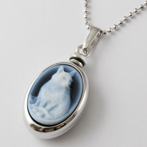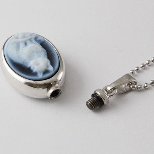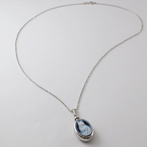 シンプルでペンダントとしても魅力の猫の彫刻のストーンカメオが付いたオーバル・カロートペンダント。ドイツ製ならではの作りの良さとハイセンス、他ではなかなか見つかりません!!愛するものを偲び、いつまでも身に着けて、未来へ生きる力と勇気を与えてもらえるでしょう。仕上げも本当に良くて高級感がありますよ。また、裏面が地金の光沢仕上げになっているので、両面使えるのが魅力ですね。バチカン部分をねじって開け中に遺灰や遺髪を収めることができます。開口部は非常に小さいので、粉末状にしたものなどを納めてください。