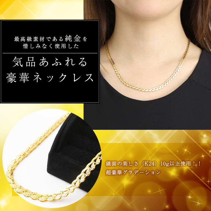 最高級素材である、純金(K24)を惜しみなく使用した、気品あふれる豪華ネックレス。華やか過ぎない、洗練されたデザインのネックレスは、落ち着いた大人の女性にぴったりです。普段の装いをぐっとエレガントに引き立ててくれます。