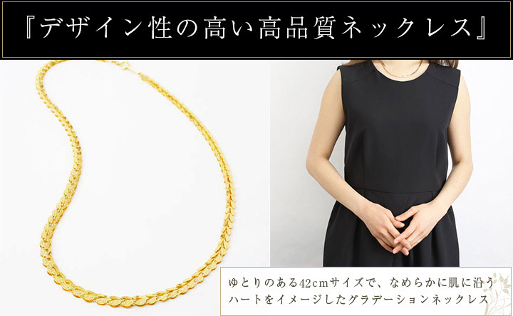最高級素材である、純金(K24)を惜しみなく使用した、気品あふれる豪華ネックレス。華やか過ぎない、洗練されたデザインのネックレスは、落ち着いた大人の女性にぴったりです。普段の装いをぐっとエレガントに引き立ててくれます。42cmという、ゆとりのあるサイズで、なめらかに肌に沿うグラデーションネックレス(首筋より胸元にかけて緩やかに太くなる)は、着け心地も抜群!!また、純金の品位の証明の刻印、「K24」が入っており、素材と品質の良さも証明されています。ハートをイメージしたデザインは片面を光沢にもう片面には柄を入れたリバーシブル仕様にしており服装やシーンに合わせた使い方ができます。