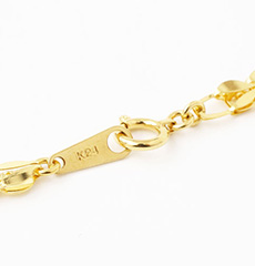 42cmという、ゆとりのあるサイズで、なめらかに肌に沿うグラデーションネックレス(首筋より胸元にかけて緩やかに太くなる)は、着け心地も抜群!!また、純金の品位の証明の刻印、「K24」が入っており、素材と品質の良さも証明されています。