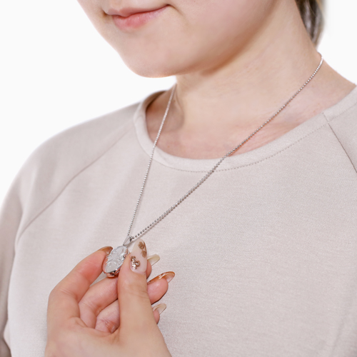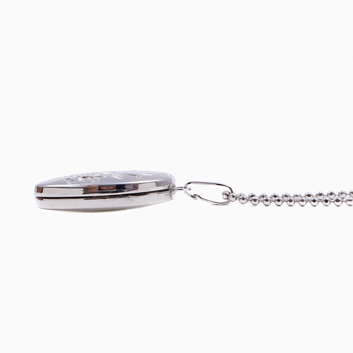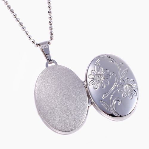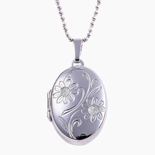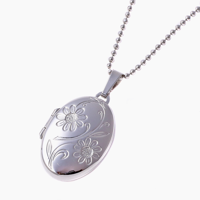 ペアーの花のイメージ模様のオーバルロケットペンダント。シンプルなシルバー素材との組み合わせは派手すぎず、合わせる洋服によってキュートな感じにもシックでクラシカルな雰囲気にもなります。フラワー模様がキュートなのに高級感を演出しています。裏側は艶消し加工を施していますので傷が目立ちにくく、その日の気分で使い分けができます。大切な人、大好きなペットなどの写真をこっそり入れて、お洒落にロケットペンダントを楽しんでください。