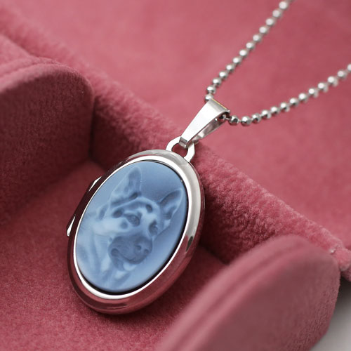 凛々しいシェパード犬の彫刻を施したストーンカメオが付いたロケットペンダント。