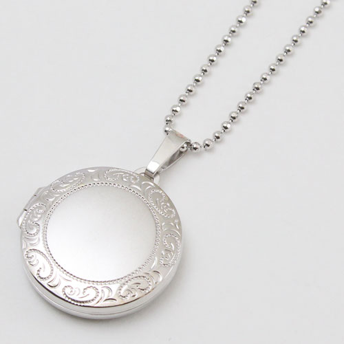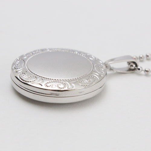 模様の縁取りのラウンドロケットペンダント。シンプルなシルバー素材との組み合わせは派手すぎず、合わせる洋服によってキュートな感じにもシックでクラシカルな雰囲気にもなります☆立体感のある模様がボリュームたっぷりで高級感がありますよ。全体に艶消し加工を施していますので傷が目立ちにくく、その日の気分で使い分け。大切な人、大好きなペットの写真をこっそり入れて、お洒落にロケットペンダントを楽しんでください。